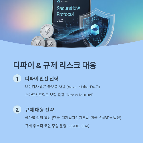 - 보안감사 받은 플랫폼 사용 (Aave, MakerDAO 등)