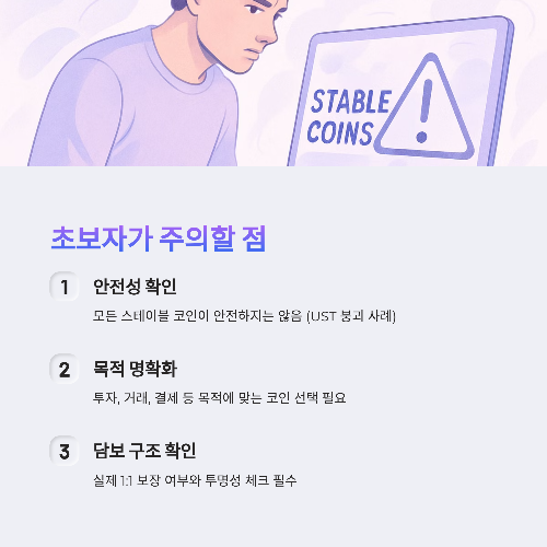 일부 스테이블 코인은 담보 구조가 불투명하거나, 알고리즘 방식으로 인해 붕괴된 사례도 있습니다. - 사용 목적을 분명히 하자