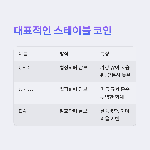 | USDT | 법정화폐 담보 | 가장 많이 사용됨, 유동성 높음 |
