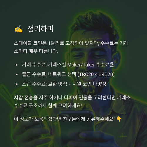 네트워크, 입출금 방식, 스테이블 코인 종류에 따라 차이가 큽니다.