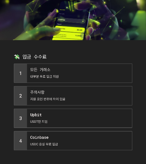 | Coinbase | 무료 | USDC 중심 무료 입금 |