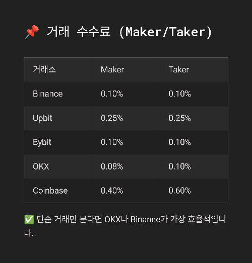 ✅ Tip: 단순 거래만 본다면 OKX나 Binance가 가장 효율적입니다.