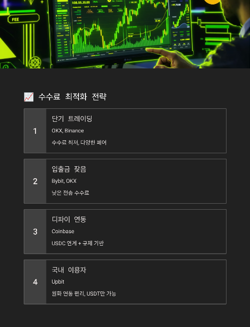 | 단기 트레이딩 | OKX, Binance | 수수료 최저, 다양한 페어 |