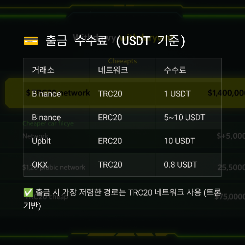 ✅ Tip: 출금 시 가장 저렴한 경로는 TRC20 네트워크 사용 (트론 기반)