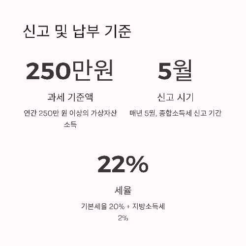 - 과세 대상: 연간 250만 원 이상의 가상자산 소득