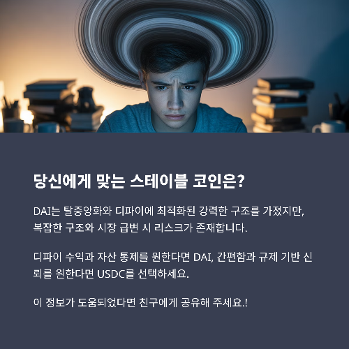 | 발행 주체 | 탈중앙 (MakerDAO) | 미국 기업 (Circle) | 민간 기업 (Tether) |